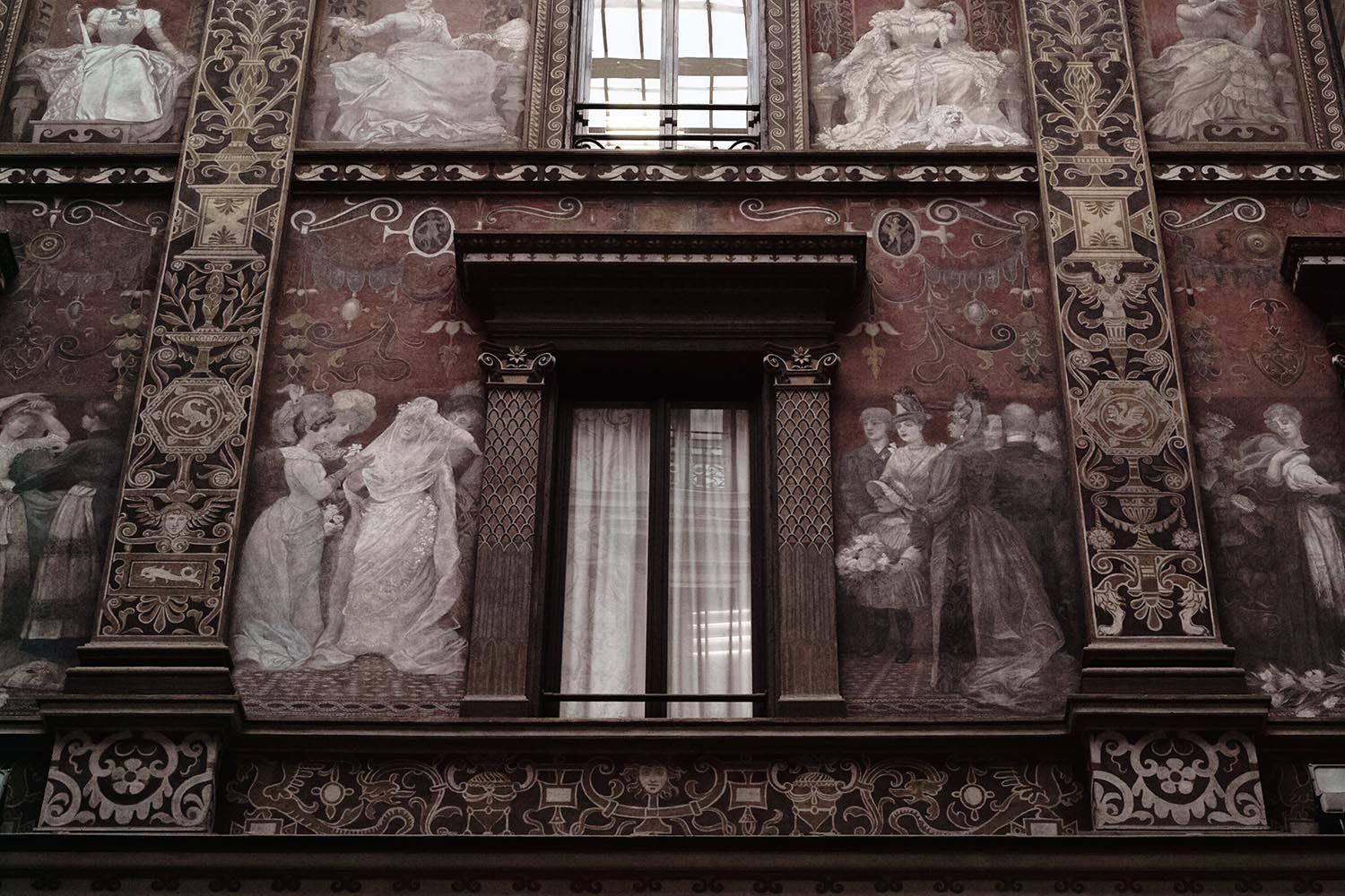 Built in 1885 and painted by Giuseppe Cellini the Galleria Sciarra is a good example of the Liberty style in Rome. The entrance is on via Marco Minguetti, not far from the Trevi fountain. The paintings are meant to depict all of women's virtues : Loyalty, Humility and Justice.